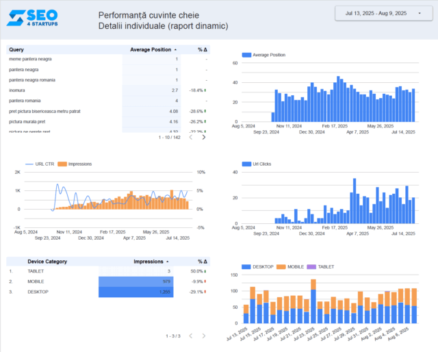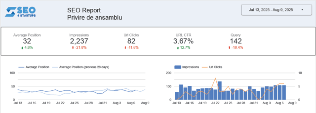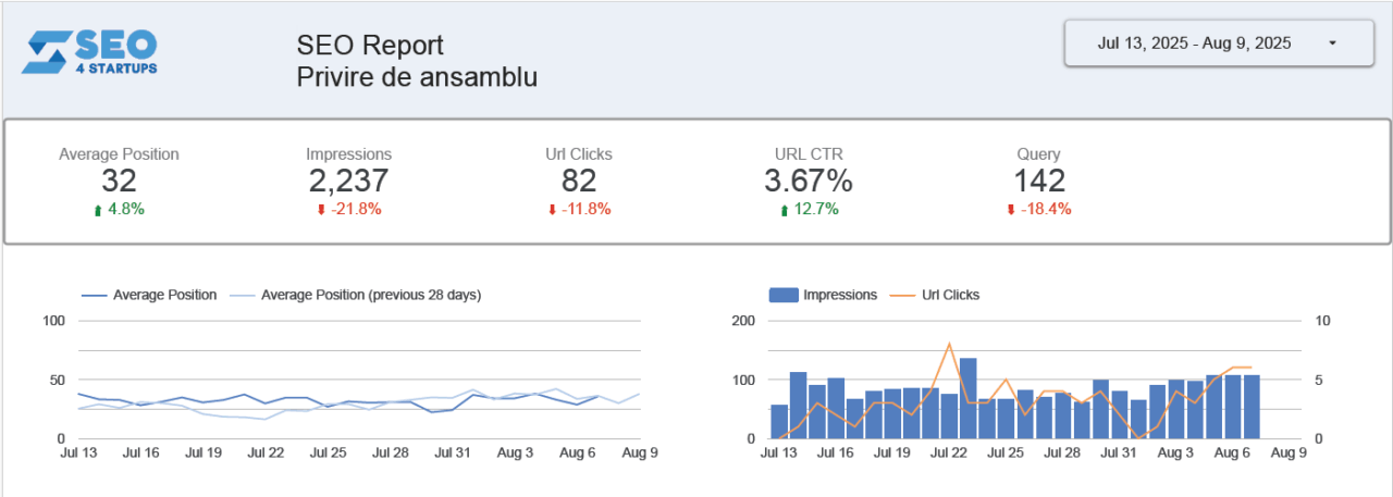 • Poziția medie a site-ului în căutările Google și cum a evoluat ea în ultimele 28 de zile.