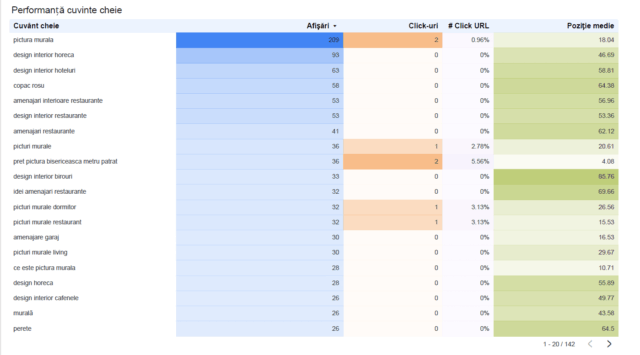 • Cuvintele cheie care au generat afișări și click-uri.