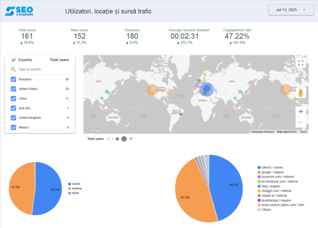 • Sursa de trafic, arătând de unde vin majoritatea vizitatorilor (Google, rețele sociale, etc.).